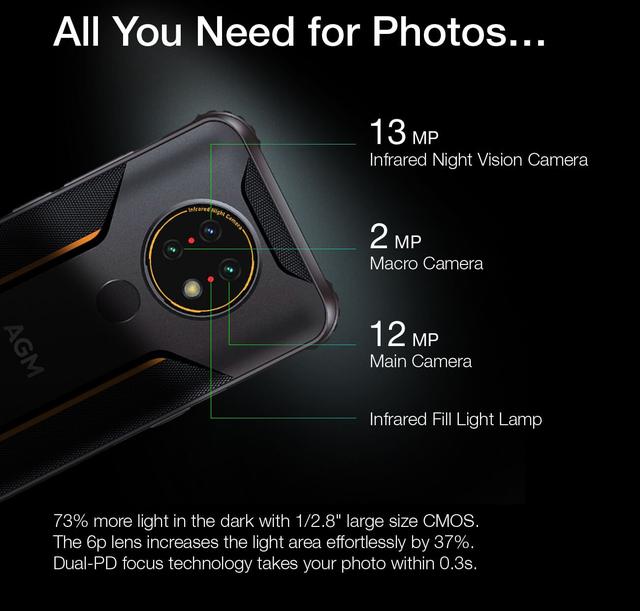 Система камер умістила в собі 3 об'єктиви, один із яких 13-мегапіксельний модуль із функцією нічного бачення, а також 2 ІЧ-діоди для підсвічування вночі. Ця функція допоможе отримати різну картину того, що відбувається навіть в умовах повної темряви. Модуль основної камери має роздільну здатність 12 Мп і так само вирізняється високою якістю знімків. Смартфон багатофункціональний і обов'язково виручить вас у найскладніших і найекстремальніших умовах!
