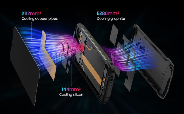 BV9300 володіє інтегрованою системою охолодження, яка забезпечує ефективне розсіювання тепла, що дозволяє знизити температуру процесора на до 18°C. Застосування графітової та мідної фольги охолодження з площею 7,392 мм² та кремнію з площею 144 мм² дозволяє забезпечити оптимальні умови охолодження для стабільної роботи пристрою під час інтенсивного використання. Завдяки інтегрованій системі охолодження новинка Блеквью БВ9300 гарантує вам прохолоду та збереження високої продуктивності навіть при тривалому використанні.