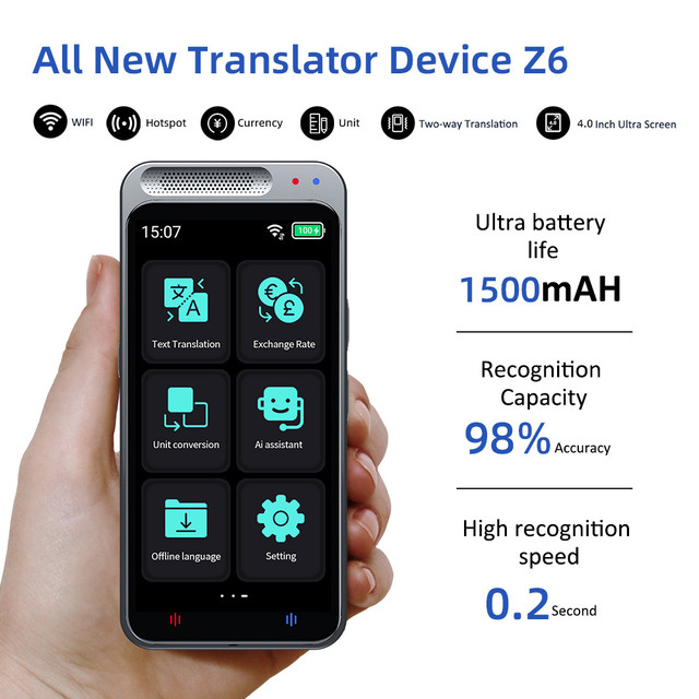 Електронний перекладач з голосу Voice Translator Z6 – це знахідка для бізнесменів, мандрівників, студентів, для роботи з іноземцями в готелях, ресторанах та інших сферах, а також просто для тих, хто вивчає іноземні мови. Голосовий перекладач Z6 легко працює навіть зі складними технічними темами.