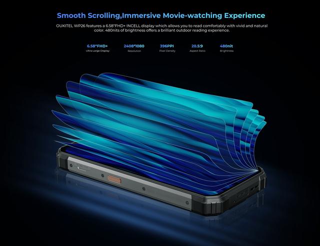 Однією з найвражаючих особливостей OUKITEL WP26 є його великий екран діагоналлю 6.58 дюймів з роздільною здатністю FullHD+, який дозволяє насолоджуватися вашими улюбленими серіалами та фільмами у максимальній якості. Апарат має роздільну здатність екрана 1080x2408 і яскравість 480 ніт, що дозволяє насолоджуватися яскравими кольорами в будь-якому освітленні, навіть при денному сяйві.